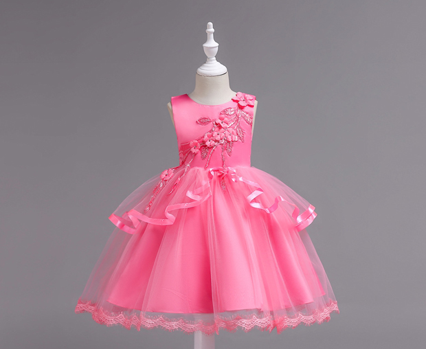 Chic Solid with multilayer dress, the upper layer is net with frills at the waist. Butterfly Applique decorated with pearl, puff-sleeve and bottom is curvy.
